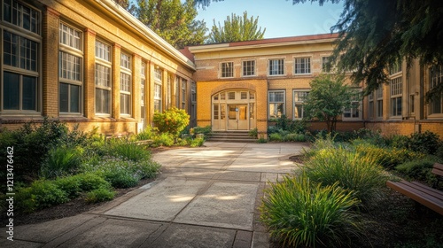 building, courtyard, garden, school, university, college, architecture, education, historic, stone, pathway, landscaping, plant, greenery, yellow, brick, window, sunny, day, exterior, facades, structure, design, peaceful, tranquil, calm, serene, summer, ground, campus, institute, academy, property, estate, venue, location, place, scene, setting