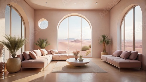 Serene Desert Vista Living Room Design with Arch Windows and Pastel Hues