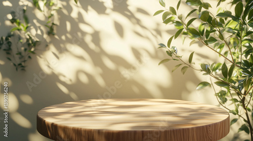 Serene empty wooden podium with morning light and leaves shadows