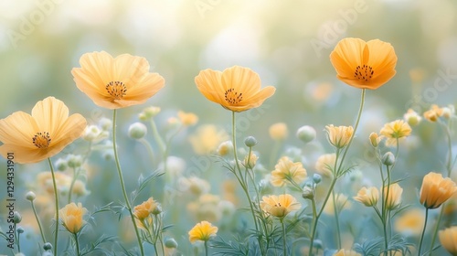 Serene field of golden cosmos flowers in soft focus light a dreamy pastel background nature photography