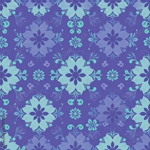 Serene Floral Damask Pattern: Elegant teal and purple floral damask seamless pattern. Perfect for textile design, wallpaper, or packaging.