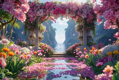 serene, three-dimensional, paradise, palmy, charming, blissful, fanciful, imagery, concept, illustration, ai, abundant, radiant, many-coloured, fantasy, brilliant, flower, atmosphere, dusk, summer, scene, landscape, beauty, meadow, sunlight, joy, magnificence