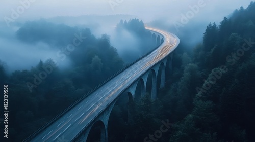 fog, landscape, road, bridge, tree, nature, transportation, scenery, travel, highway, mist, architecture, structure, forest, journey, calmness, twilight, serenity, isolation, curvature, view, calm, asphalt, vehicle, movement, horizon, scenic, environment, foliage, winding, peaceful, dramatic, sky, cloud, dusk, daylight, soft light, destination, natural beauty, green, pathway, adventure, aerial view, urban, countryside, dreamlike