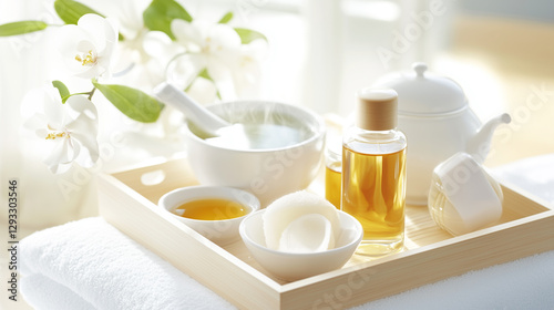 Serene Foot Spa Experience: Luxurious Tray of Oils, Scrubs, and Steaming Water for Pampering and Relaxation