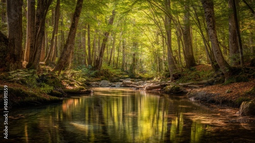 Serene Forest Landscape with Gentle Stream and Vibrant Green Foliage Illuminated by Soft Natural Light