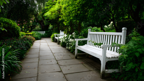 Serene garden pathway with white benches surrounded by lush greenery and vibrant flowers