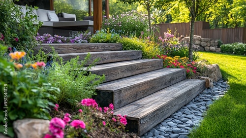 garden, backyard, wooden, step, flower, patio, landscaping, design, nature, greenery, serene, tranquil, peaceful, raised, bed, home, decor, lush, colourful, plant, gardening, leisure, relaxation, yard, floral, pathway, natural, scenic, environment, calm, oasis, layout, bloom, foliage, vibrant, aesthetic, environmentally friendly, sunlight, ambience, retreat