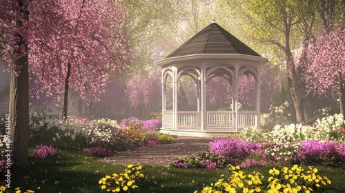 Serene Garden with Gazebo Surrounded by Blooming Flowers and Trees