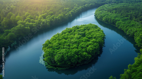 Serene Green Forest Surrounded by Curving River - Aerial View of Lush Woodland Oasis with Scenic Waterway