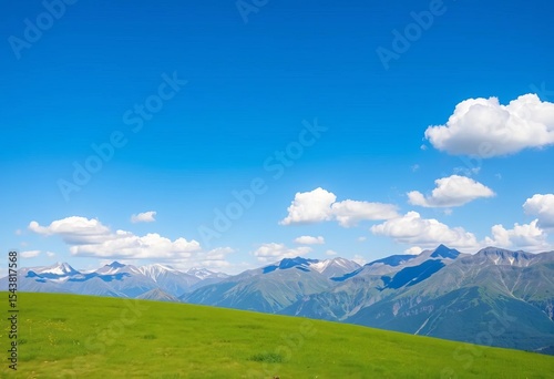 Serene green lawn overlooking a majestic mountain range under a clear blue sky with fluffy white clouds, mountain landscape, view