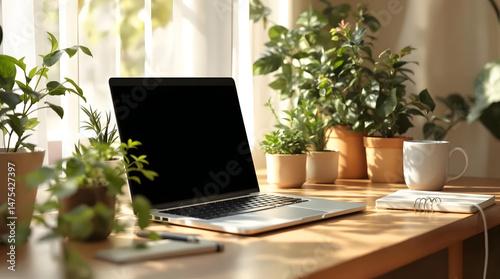Serene Home Office Workspace with Laptop and Lush Greenery