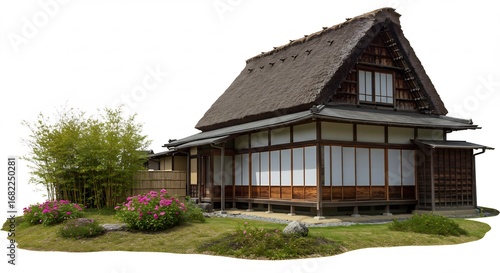 house, home, building, architecture, dwelling, residence, structure, thatched, roof, gable, wooden, timber, japanese, style, traditional, design, rural, countryside, garden, landscaping, plant, flower, shrub, bamboo, fence, pathway, stone, grass, lawn, exterior, facades, window, door, wall, beam, post, support, vertical, horizontal, aesthetic, serene, peaceful, calm, tranquil, minimalist, simple, elegant, natural