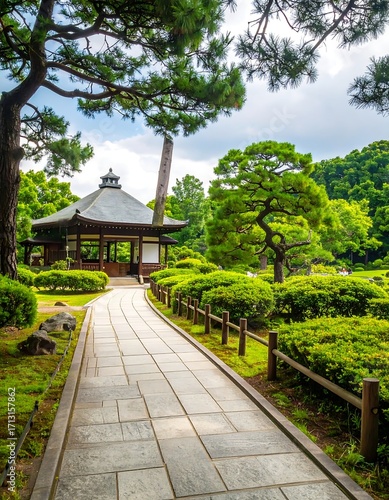 japanese, garden, path, pavilion, tree, lush, green, tranquil, calm, stone, paving, sky, cloudy, summer, nature, peaceful, zen, architecture, wooden, shrubbery, landscape, perspective, detail, beauty, asian, kyoto, decorative, structure, travel, tour tourism, photo, image, scenic, view, relaxing, harmony, paseo, element, design, wood, shadow, light