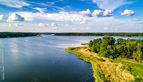 lake, water, sky, cloud, tree, forest, nature, scenic, calm, tranquil, beautiful, green, blue, summer, sunlight, aerial, expansive, panoramic, wide, horizon, lush, calmness, fresh, outdoors, calmness, huge, peaceful, view, shoreline