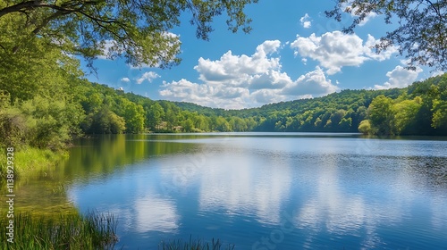 Serene lake landscape under a vibrant blue sky. Concept of nature, tranquility, and peace.