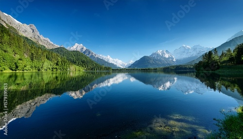 serene lake reflecting lush mountains under a clear sky