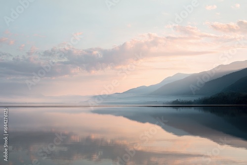 Serene lake surface reflecting soft morning light and pastel sky.