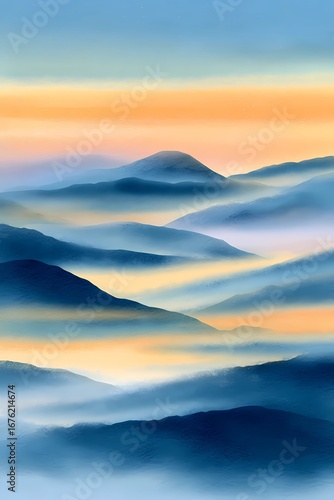 Serene landscape of fog-covered hills under soft dawn light, evoking stillness and natural beauty.