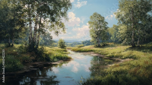 landscape, stream, water, tree, meadow, grass, sky, cloud, nature, serene, peaceful, calm, summer, birch, light, sunlight, green, blue, horizon, distance, idylli, painting, art, rural, scenic, vista, outdoors, environment, countryside, river, wood, grove, foliage, branch, leaf, daytime, clear, perspective, pathway, bank, shore, field, open, beauty, artwork, pastoral, quiet