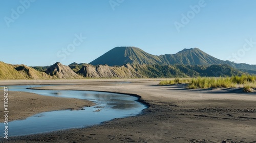 landscape, mountain, water, nature, vale, wilderness, river, calm, scenery, environment, blue skies, grass, terrain, geology, travel, earth, peak, scenic, calmness, daylight, exploration, beauty, natural, horizon, foliage, area, sandy, sunlight, lush, adventure, rural, remote, formation, cloud, summer, vista, background, peaceful, topography, wild, creek, meadow, scene, pristine