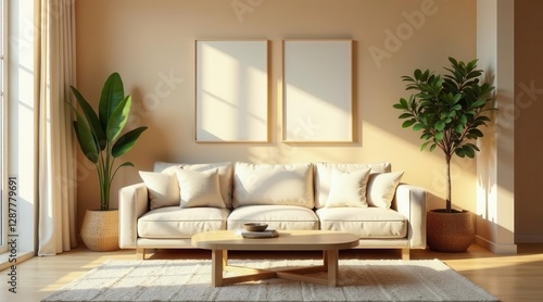 Serene Living Room Design with Neutral Tones and Natural Light, Featuring a Comfortable Sofa, Stylish Coffee Table, and Elegant Potted Plants