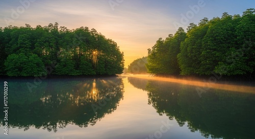 Serene Mangrove River at Dawn: A Tranquil Reflection of Nature's Beauty at Sunrise