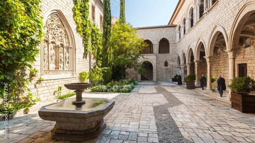 Serene Medieval Courtyard with Stone Architecture and Fountain