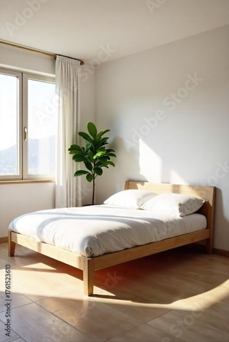 Serene Minimalist Bedroom Calming Neutral Decor, Simple Wooden Bed, Cozy Atmosphere