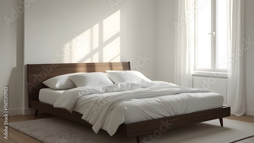 Serene Minimalist Bedroom, Soft White Bedding on Dark Espresso Wood Bedframe, Natural Light