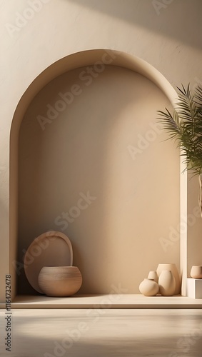archway, minimal, interior, design, serene, calm, peaceful, tranquil, home, decor, earthy, tone, beige, neutral, light, sunlight, shadow, aesthetic, minimalist, modern, style, simple, clean, contemporary, elegant, sophisticated, stylish, room, space, ambience, pottery, vase, plant, palm, wooden, object, natural, texture, arrangement, composition, harmony