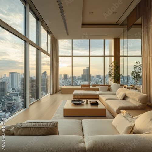 minimalist, japanese, penthouse, panoramic, city, skyline, interior, design, modern, luxury, elegant, roomy, light, natural, wood, glasses, urban, nature, tranquil, comfortable, aesthetic, living room, furniture, architecture, harmony, contemporary, open space, sunset, lifestyle, city landscape, relaxation, view, color palette, bright, soft, stylish, inviting, chic, clean, atmosphere, plant, cushion, cosy, ambience, retreat