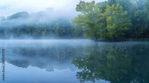 Serene misty morning: tranquil lake enveloped in fog, trees mirrored on its surface, capturing the beauty of nature's reflection