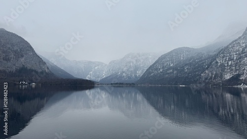 Serene Misty Mountain Lake Reflection Surrounded by Winter Snow-Covered Alpine Peaks in Hallstatt, Austria. Misty mountain lake with still water reflecting conveying tranquility and natural beauty