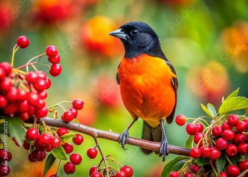 Serene Moment: An Orange and Black Bird Perched on a Branch with Berries, Capturing the Essence of Nature's Tranquility in a Peaceful Setting