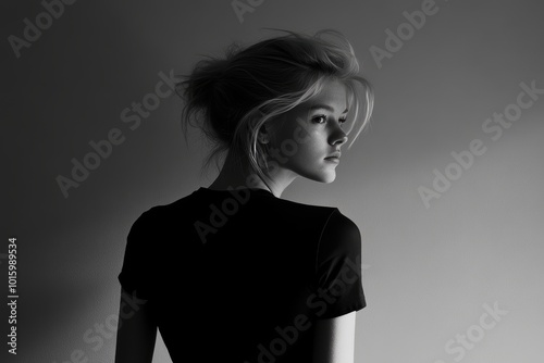serene, monochrome, portrait, young, woman, caucasian, contemplation, black, white, adult, female, profile, side, view, reflective, thoughtful, tranquil, peaceful, elegance, simplicity, beauty, natural, coiffure, calm, emotion, mood, expression, studio, minimalist, contrast, shadow, light, artistic, gentle, solitary, individual, person, stylish, modern, fashion, gaze, young adult