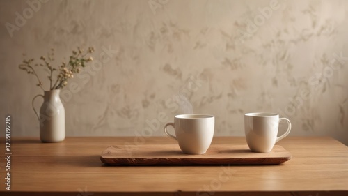 Serene morning scene Two steaming mugs of hot beverage on a wooden tray, minimalist aesthetic, simple decor, calming atmosphere, tranquil setting
