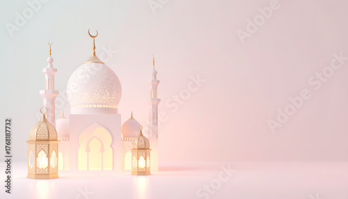 Serene mosque with illuminated golden lanterns against a soft pastel background, embodying the spirit of Islamic celebration and peace, perfect for Ramadan or Eid greetings