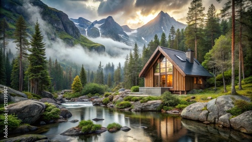 Serene Mountain Cabin Retreat by a Tranquil River, Nestled Amongst Majestic Peaks at Dawn