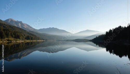 Serene mountain lake reflects clear blue sky, distant snow-capped peaks. Green forest borders calm water surface. Mist clings to mountain ranges, creating tranquil atmosphere for outdoor recreation,