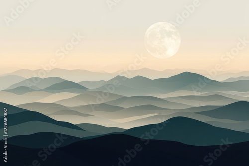 Serene mountain landscape at dawn or dusk with a large moon in the sky.