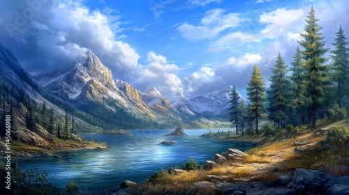 Serene Mountain Landscape with Clear Blue Lake, Towering Peaks, Lush Evergreen Trees, and a Bright Sky with Dramatic Clouds Reflecting on Calm Waters