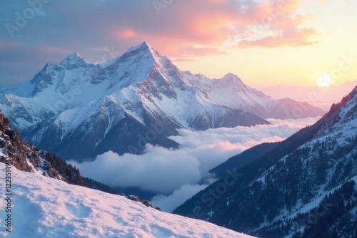 Serene mountain peaks shrouded in snow, softly illuminated by dawn's gentle light , nature, peaceful