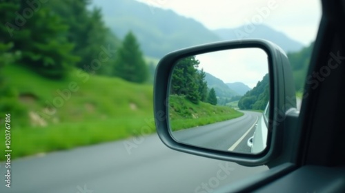 road, mirror, car, vehicle, automobile, driving, travel, journey, landscape, scenery, mountain, hill, tree, nature, green, asphalt, highway, transportation, adventure, outdoors, perspective, view, way