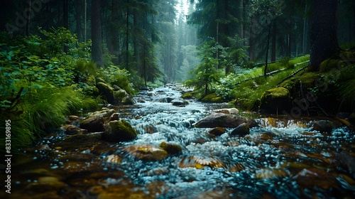 Serene Mountain Stream Flowing Through Lush Green Forest Tranquil and Refreshing Natural Scenery