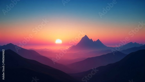 Serene mountain sunset with vibrant sky and layered hills in a tranquil landscape