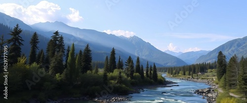 Serene mountain vista, flowing river, lush trees, wildlife silhouettes , vector art, stream