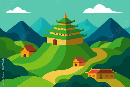 Serene Mountaintop Temple A Picturesque Asian Landscape Illustration