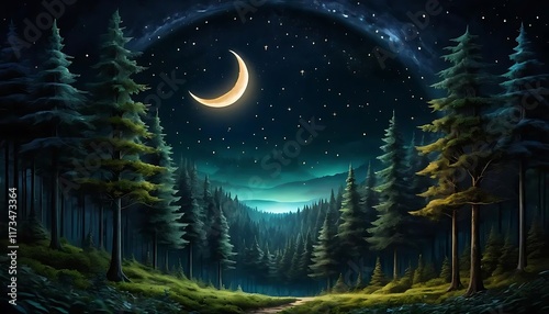 forest, night, moon, crescent, star, tree, path, wood, dark, serene, mystical, magical, tranquil, peaceful, calm, quiet, silent, mysterious, shadowy, deep, evergreen, pine, conifer, sky, celestial, heavenly, landscape, nature, scenery, wilderness, solitude, remote, secluded, enchanting, dreamy, ambience, atmosphere, beauty, wonder