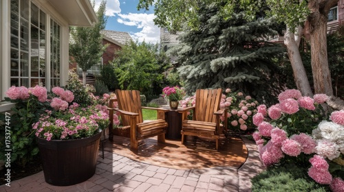 garden, flower, patio, chair, relaxation, nature, greenery, blooming, pink, landscaping, serene, decoration, sunlight, furniture, calmness, backyard, garden design, blossom, wooden, peaceful, bright, summer, scenery, floral, vibrant, leisure, garden path, home, cosy, inviting, plant, natural beauty, botanical, shade, garden flower, horticulture, floral arrangement