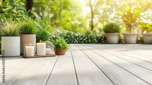 Serene Outdoor Space with Natural Elements, Candles, and Lush Greenery on a Wooden Deck Bathed in Soft Sunlight, Perfect for Relaxation and Tranquility
